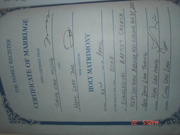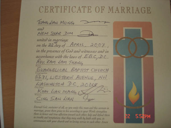 Marriage Certificate | Marriage Certificate | Inntekpa Pa Thang Lian Pau Lungdam thu genna | Innteknu Nu Cing Za Lun Lungdam thu genna |