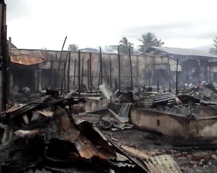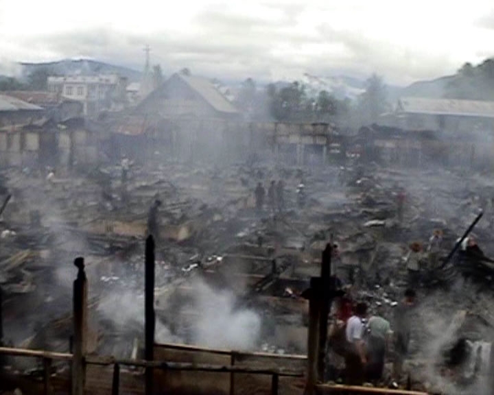 Mungpi Au gust 15, 2006- A devastating fire broke out in a marketplace in Tahan in Kalemyo Township, Sagaing division, upper Burma, according to eyewitness. The fire broke out at about 9 p.m. local time and the entire market place, where a variety of commodities ranging from textile and traditional costumes to mechanical hardware and vegetables are available, went up in flames, an eyewitness told Mizzima. “Fire fighters rushed to the market but could not put out the fire. The fire gutted the whole market,” said the witness adding that pouring rain stopped the fire from spreading to residential houses. While a few suggested that the fire could have broken out from an electric pole situated near the market, a few think it was planned arson. However, with authorities conducting investigations, the cause of the fire still remains unknown.T he market, known as Tahan bazaar, was the second largest market in Kalemyo Township and it had become the fastest growing market with over 100 shops. An ethnic Chin dominant area, the market was famous for its ethnic costumes and homemade edibles. According to a businessman, a suit of Chin ethnic costume costs over 100,000 Kyats (approximately US $ 76). He added that there were a number of such ethnic costume shops in the market.So far there has been no report of paying compensation to shop owners, who are bemoaning their loss. *Posted on Friday, August 15, 2006 @ 11:38:20 pm EST by Webmaster*