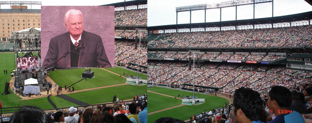 Source - Billy Graham Evangelistic Association website BALTIMORE, July 10, 2006— Preaching under the lights at one of America’s premier major league ballparks, Franklin and Billy Graham proclaimed the Gospel of Jesus Christ to more than 81,000 people gathered here for the Metro Maryland Festival. Instrumental in sparking urban renewal in downtown Baltimore when it was built 14 years ago, Oriole Park at Camden Yards was the site of spiritual transformation this past weekend as over 3,200 people made decisions for Christ at the three-day Festival. ... read more .... *Posted on Monday, July 10, 2006 @ 11:55:20 pm EST by Webmaster*
