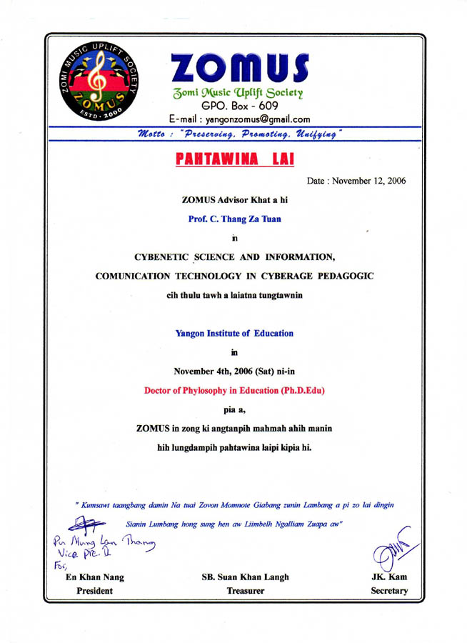 Photo: Zomi Music Uplift Society (ZOMUS), Yangon pan Professor C. Thang Za Tuan in Ph.D a ngahna lungdampihna leh Pahtawina laipi